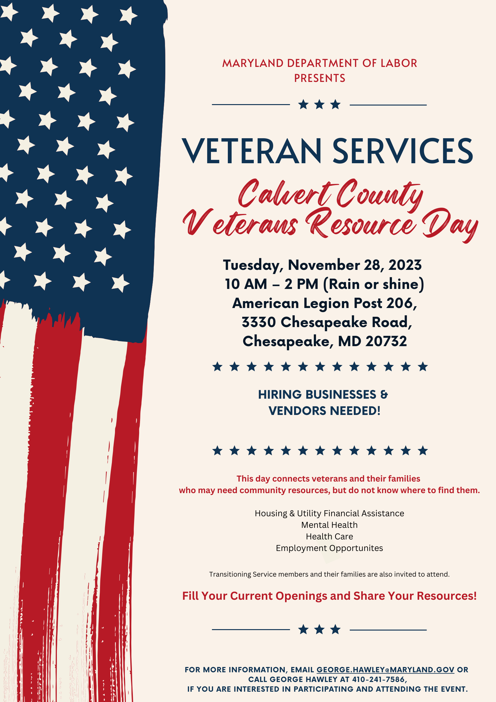 Calvert County Veterans Resource Day Date: Tuesday November 28, 2023 | Time: 10AM-2PM Location: Chesapeake Beach, MD View Flyer for more details. rtruslow2023-11-06T15:45:31-05:00November 6th, 2023| Share This Story, Choose Your Platform! FacebookXRedditLinkedInTumblrPinterestVkEmail Related Posts #1 New York Times Bestselling Author Kwame Alexander in Calvert County on March 9 #1 New York Times Bestselling Author Kwame Alexander in Calvert County on March 9 Construction Manufacturing & Transportation Job Fair Construction Manufacturing & Transportation Job Fair Charles County Job Fair Charles County Job Fair Pop-up Job Fair Pop-up Job Fair Customized recruitment with Prince George’s County Police Department Customized recruitment with Prince George’s County Police Department