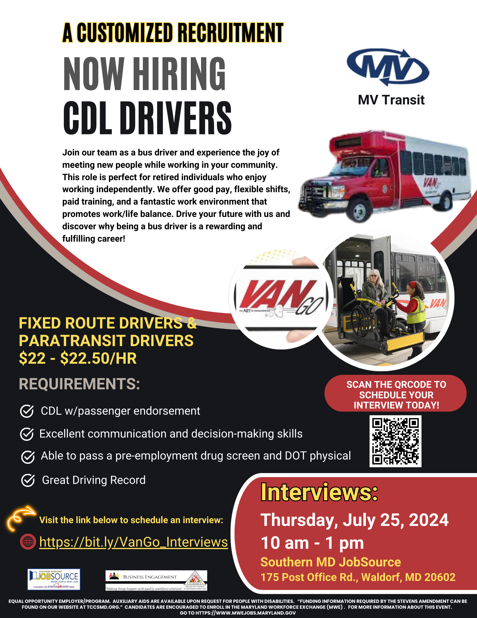 Hiring Event for CDL Drivers Date: July 25 10am-1pm View Flyer for more Details rtruslow2024-07-22T13:10:46-04:00July 22nd, 2024| Share This Story, Choose Your Platform! FacebookXRedditLinkedInTumblrPinterestVkEmail Related Posts #1 New York Times Bestselling Author Kwame Alexander in Calvert County on March 9 #1 New York Times Bestselling Author Kwame Alexander in Calvert County on March 9 Construction Manufacturing & Transportation Job Fair Construction Manufacturing & Transportation Job Fair Charles County Job Fair Charles County Job Fair Pop-up Job Fair Pop-up Job Fair Customized recruitment with Prince George’s County Police Department Customized recruitment with Prince George’s County Police Department