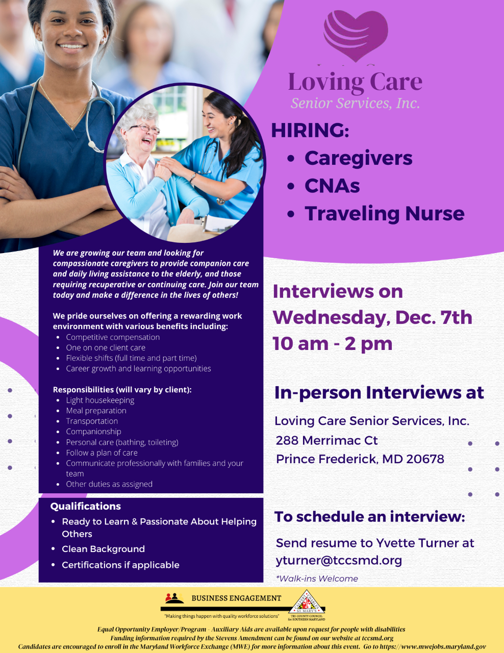 Loving Care: Senior Service, Inc. Hiring: Caregivers | CNAs | Traveling Nurse Time: 10AM-2PM Location: Prince Frederick, MD View Flyer for more details. rtruslow2022-12-06T16:31:14-05:00December 7th, 2022| Share This Story, Choose Your Platform! FacebookXRedditLinkedInTumblrPinterestVkEmail Related Posts #1 New York Times Bestselling Author Kwame Alexander in Calvert County on March 9 #1 New York Times Bestselling Author Kwame Alexander in Calvert County on March 9 Construction Manufacturing & Transportation Job Fair Construction Manufacturing & Transportation Job Fair Charles County Job Fair Charles County Job Fair Pop-up Job Fair Pop-up Job Fair Customized recruitment with Prince George’s County Police Department Customized recruitment with Prince George’s County Police Department