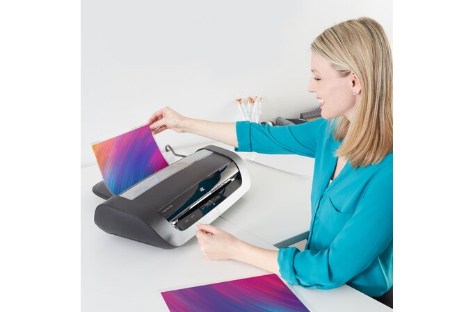 The 12″ laminating width allows for greater speed and variety on projects. Laminating pouches in letter size (8 ½” x 11”) and tabloid size (11” x 17”) available for purchase.