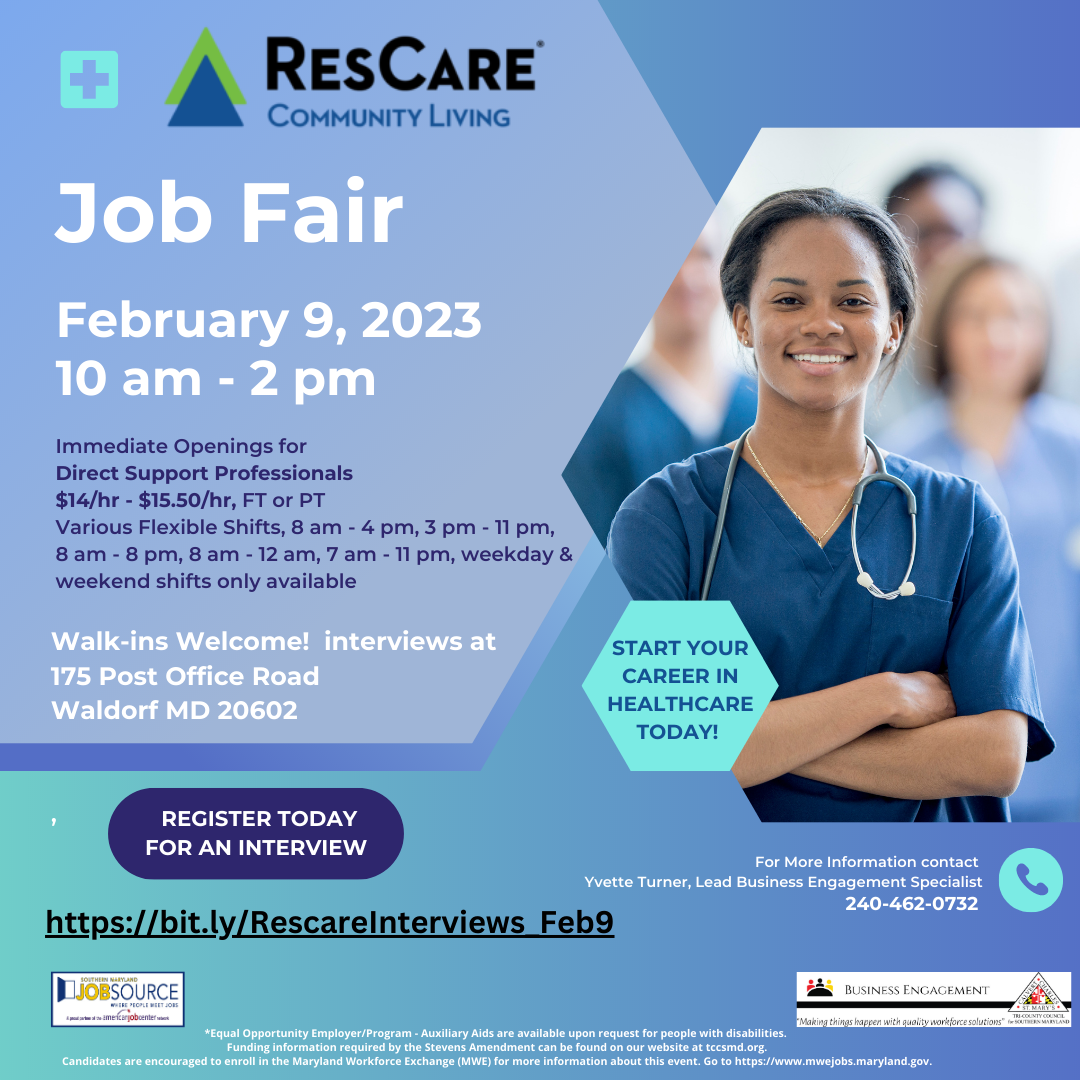 ResCare Community Living: Job Fair Date: Thur. February 9th Time: 10AM-2PM Location: Waldorf, MD View Flyer for more details. rtruslow2023-02-09T10:54:20-05:00February 9th, 2023| Share This Story, Choose Your Platform! FacebookXRedditLinkedInTumblrPinterestVkEmail Related Posts #1 New York Times Bestselling Author Kwame Alexander in Calvert County on March 9 #1 New York Times Bestselling Author Kwame Alexander in Calvert County on March 9 Construction Manufacturing & Transportation Job Fair Construction Manufacturing & Transportation Job Fair Charles County Job Fair Charles County Job Fair Pop-up Job Fair Pop-up Job Fair Customized recruitment with Prince George’s County Police Department Customized recruitment with Prince George’s County Police Department