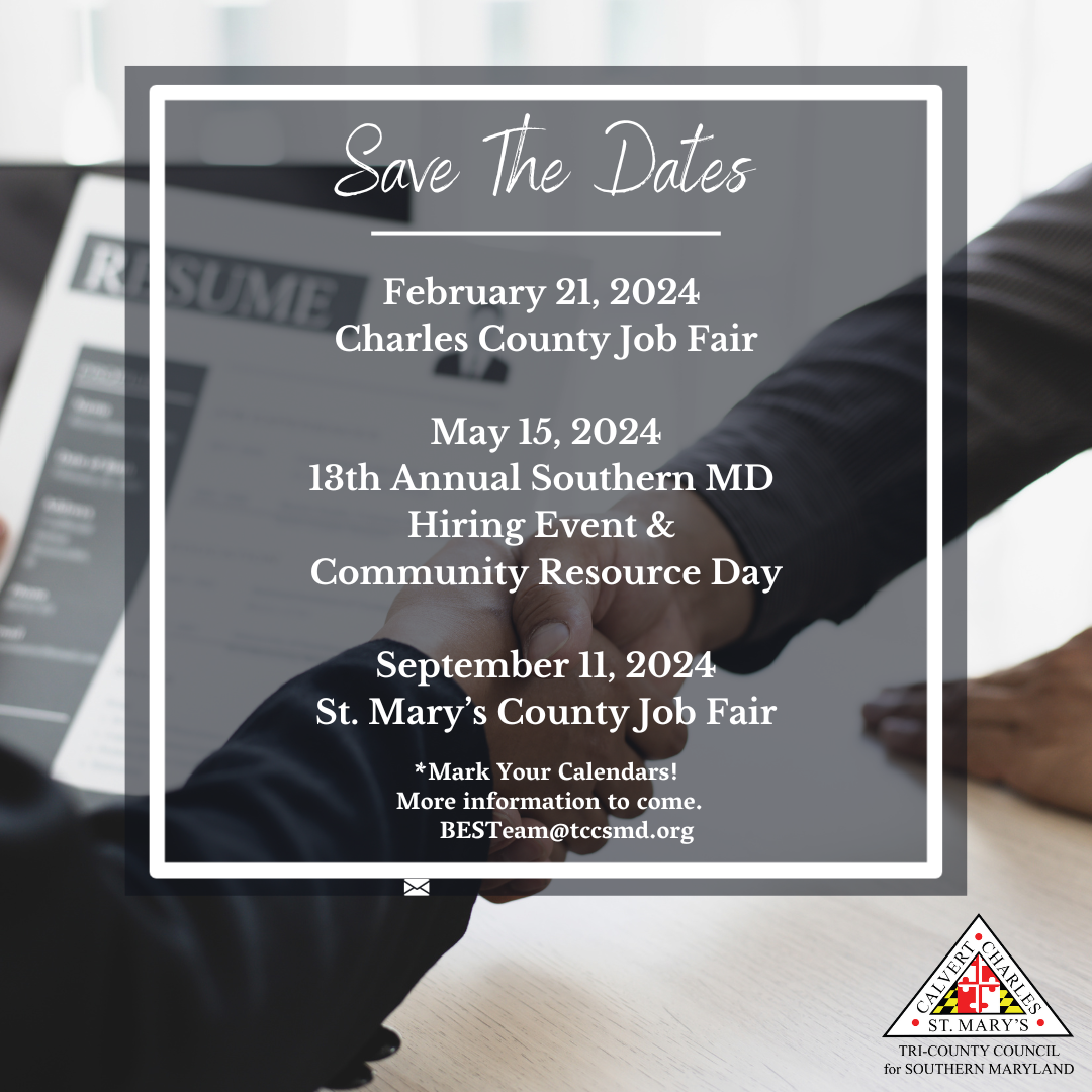 Save the Dates: Southern Maryland County Job Fairs Date: February 21, 2024 | May 15, 2024 | September 11, 2024 View Flyer for more details. rtruslow2024-02-01T08:02:03-05:00February 1st, 2024| Share This Story, Choose Your Platform! FacebookXRedditLinkedInTumblrPinterestVkEmail Related Posts #1 New York Times Bestselling Author Kwame Alexander in Calvert County on March 9 #1 New York Times Bestselling Author Kwame Alexander in Calvert County on March 9 Construction Manufacturing & Transportation Job Fair Construction Manufacturing & Transportation Job Fair Charles County Job Fair Charles County Job Fair Pop-up Job Fair Pop-up Job Fair Customized recruitment with Prince George’s County Police Department Customized recruitment with Prince George’s County Police Department